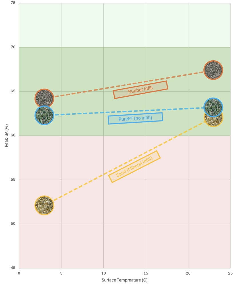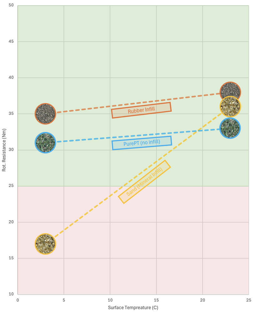 In the graphs this is very clear. From 23°C down to 3°C the performance curve for the sand or mineral system drops away from the green (FIFA) range of preferred values from both grip and shock absorption, while rubber filled and Pure PT systems remain stable.